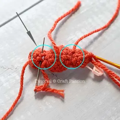 a. With a long tapestry needle, sew the arms at round 30, 36 stitches apart. After sewing 2 arms, do not cut the yarn, instead, cross the yarn to other arms to make a stitch then pull the yarn to sink the arms, then knot to secure the position. You can run the yarn through the head a few times to prevent the yarn from snapping in the long run.