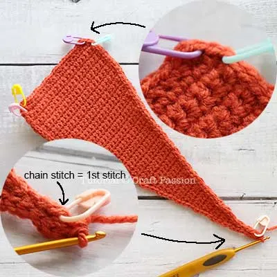 Row 1: ch 19, Inc in 2nd ch from hook, sc 16, inc, turn. {20}