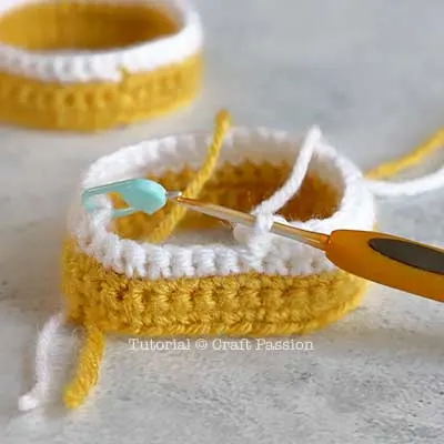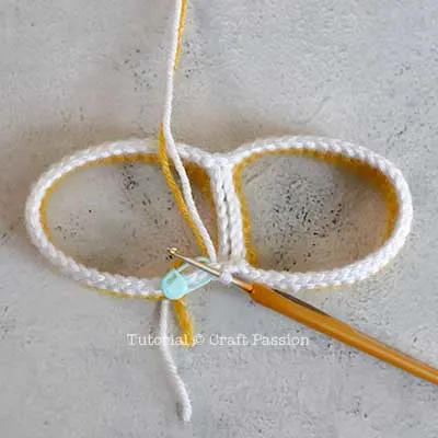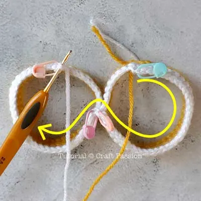 To make the second leg piece, begin with Yellow yarn: