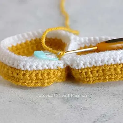 To make the second leg piece, begin with Yellow yarn: