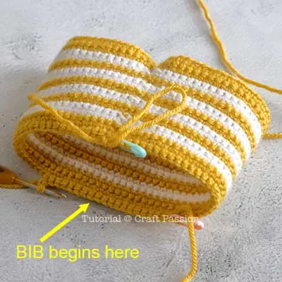 continue to sc 12 on the edge of the body to reach the bib, then sc 7 along the slope of the bib, 2sc at the first corner of the bib, sc 12, 2sc at the second corner of the bib, sc 7 along the slope of the bib, sc 12 on the body.