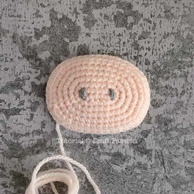 c. Sew eyes near the snout at Round 16. Instead of cutting the yarn after stitching the first eye, insert the needle into the head and emerge out from the position of the second eye to sew another eye.