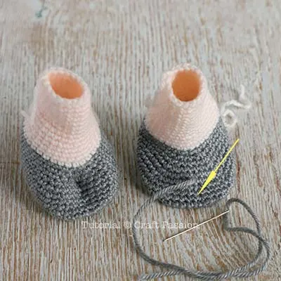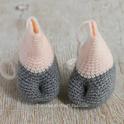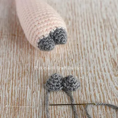 Fold the leg at Round 7, with a new strand of gray yarn, sew both layers for 6 stitches from the edge. This is to create a dent line that resembles the hoof.
