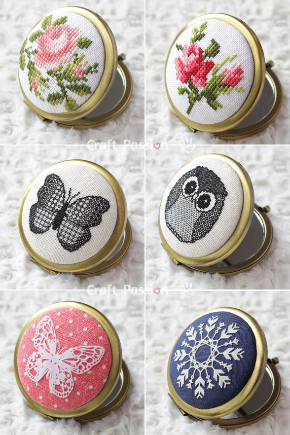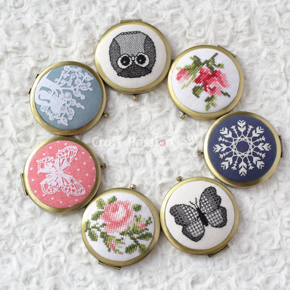 For a more intricate design, you may cross stitch a small pattern for the pocket mirror. If your favorite cross stitch pattern is too big for the pocket mirror, use higher thread count of Aida fabric to scale down the size so that they fit into 2 1/2″ diameter. My sister cross-stitches them for me and I really like them a lot.