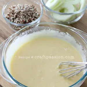 - Place flour in a clean mixing bowl and add sugar, butter, eggs, and milk. Mix the batter with a hand whisk until well combined.