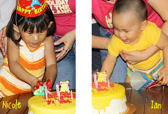 Some snap shots of them enjoying their birthday party. It is kind of difficult to get them to post beautifully in 1 photo somehow…. Nicole was still wearing the knit top I made for her.