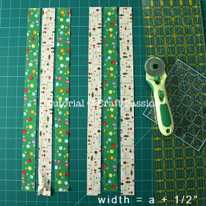 - Fabric strip A & B, in contrasting color. 4 strips for Fabric A and 5 strips of fabric B. Width= finished small square dimension (a) + 1/2″, or, Width= (finished block/3) + 1/2″