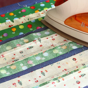 - Piece 2 contrasting strip together with right side facing each other and aligned edge, sew them together on the long edge with 1/4″ foot.