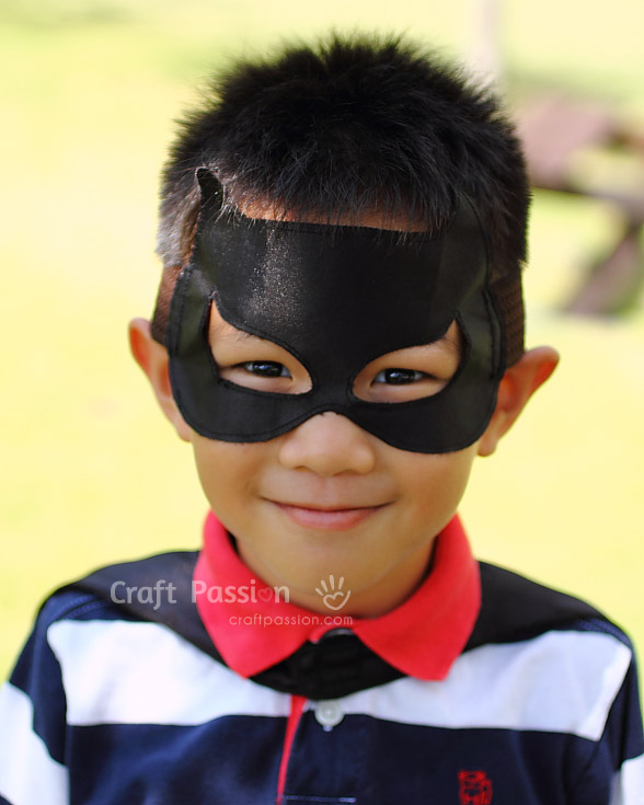 I sewed a cat party mask to match the batman cape by using this tutorial. The tutorial is using felt with interfacing as the backing but since I used satin fabric, I add another layer of satin fabric instead of the bare interfacing at the back.