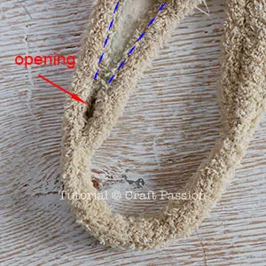 Place both ears with the fabric side together, align and make a small stitch (at the broadest side) to bring both ears together.