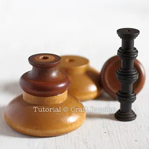 To make a tall round tower stand, you need 4 knob-bases, 2 small round wood knobs, 2 big round wood knobs, some jute twine, super glue, and sandpaper.