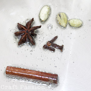 Add ingredient C, i.e: cinnamon, star anise, cloves, and crushed cardamoms to fry.