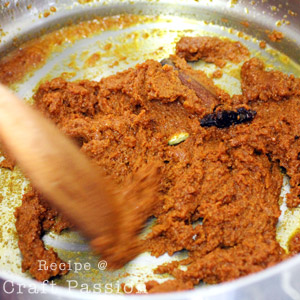 The curry paste will turn to brown and you will notice oil begins to produce from the sauteed curry paste.