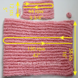 Band: Cast on 12 sts on a knitting needle and knit fisherman ribs stitch until you reach 44 rows.