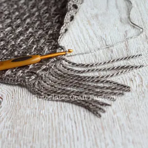 I used twisted fringe method to make the 4″ long fringes. I adapted this tutorial to make the twisted fringe but I make it longer and skip 1 stitch between the fringe.