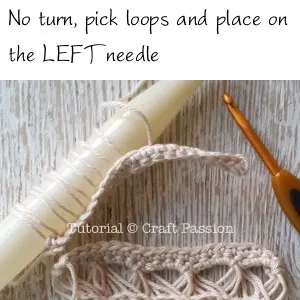** This is the “pick loop and place on RIGHT needle” and it is different from most of the online tutorial that showing “pick loop and place on LEFT needle”, the former method need to turn the work and the latter don’t. Refer picture below to see the slight different on the segment line between the broomstick lace layers.