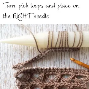 Most online tutorials, be it written or step-by-step video tutorials, will guide you to pick loops and place them on the left needle, but there is a slight variation in this crochet scarf design. The difference is just to turn your work and pick loops to place on the right needle. A flatter but more defined straight V line between the broomstick lace layers is the result of this little change. Get more details on this simple crochet scarf pattern and view the differences between the left vs. right needle pick below.