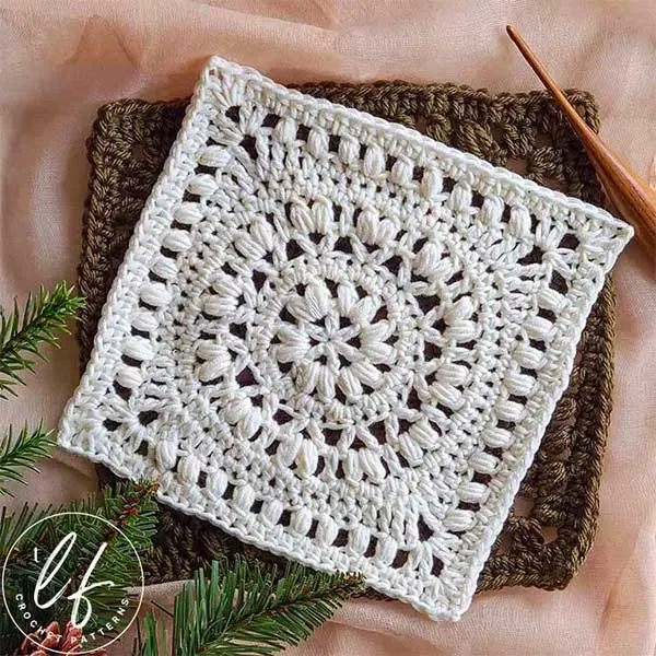 This is such a stunning textured square pattern. Puff stitches are typically used in part of a sunburst granny square pattern. In this case, this stitch pattern is used throughout the project, making the finished piece look fluffy.
