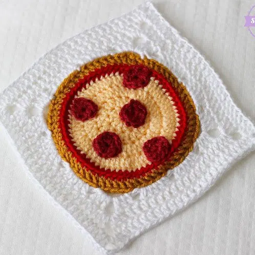 This playful square block might increase your appetite. The little pepperonis are too adorable to handle. Considering the shape of the pizza, this is a granny square circle turned into a square!