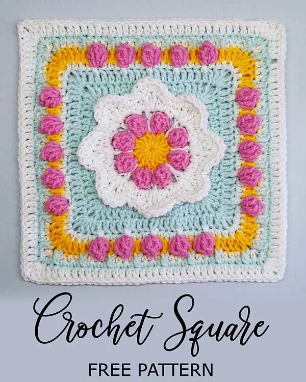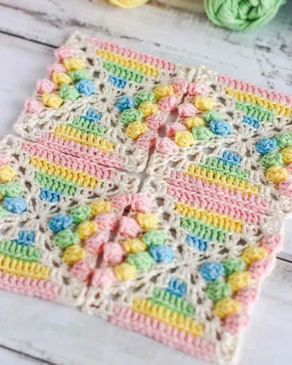 Apart from the basic stitches, you’ll be working with the popcorn stitch and double crochet 3 together. Using a single color for this square design will look as good as the multicolored ones since it has such a beautiful texture.