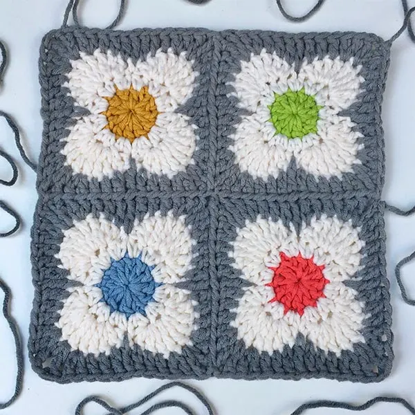 There are not one but several ways to turn a flower motif into a crochet square. Some patterns make a flat flower square, while others have a 3D effect popping out from the center. Aside from the most popular sunburst granny, there’s also the daisy square, African flower square, and other unique crochet granny square patterns.