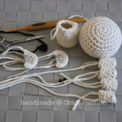 Remember to leave a long yarn end (about 6-8″) for every part so that you will have enough yarn to sew.
