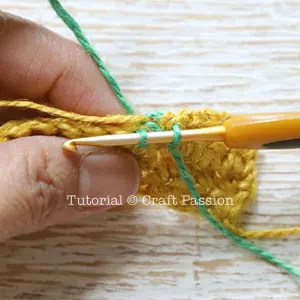 Still at Row 4, Since the Yellow yarn is still required after working on the Green stitch, we need to carry it along and hide it in the Green stitches.