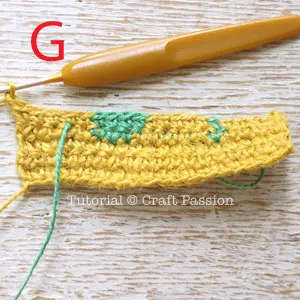 8. Work on Row 5 with a similar technique of color-change and yarn-carry-along that you have done in row 4. However, take note that you will need to carry the Green yarn to the next 2 stitches as shown in the picture. The reason is that we need to work on Green stitches at the 4th stitch on row 6, so carry the yarn to where it needed to be used for the next row. Pic G.
