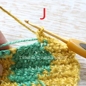 11. At Row 10, carry the Green yarn in the Yellow stitches until it is needed for color change.Pic J.