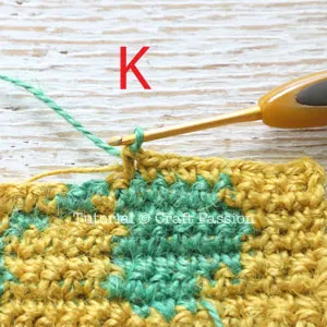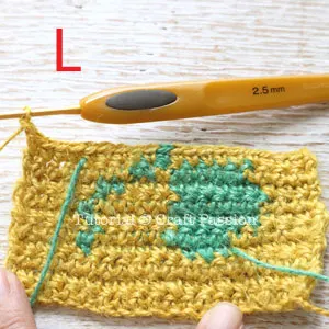 13. Still at Row 10, again, carry the Green yarn to the next 5 stitches for it to standby for Row 11. Pic L.