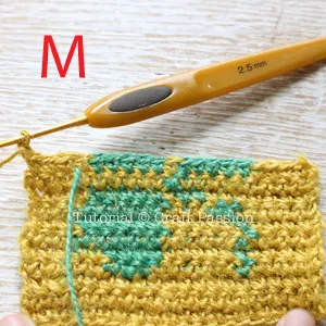 Still at Row 4, Since the Yellow yarn is still required after working on the Green stitch, we need to carry it along and hide it in the Green stitches.