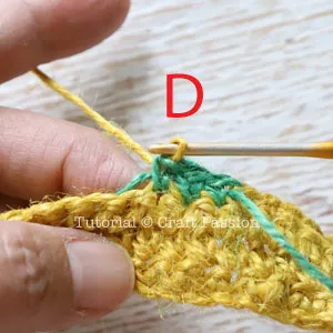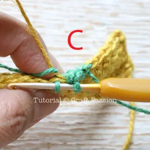 Follow the pattern to work on stitches in Yellow yarn until the last yarn-over, pull through the loops with the Green yarn. Pic B.