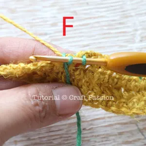 Row 4: sc in 2nd st from the hook, sc in next 4 sts, change yarn to G, sc in next 3 sts, change yarn to Y, sc in next 6 sts, change yarn to G, sc in next st, change yarn to Y, sc in next 4 sts, ch, turn. [Refer Pic B, C, D, E  & F]