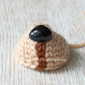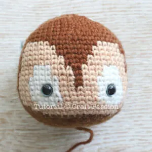 Align the muzzle of the deer amigurumi with the marking between the eyes as shown in the picture. Pin, sew and stuff the muzzle to the head.
