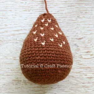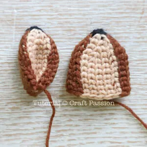 Ms. DuDu the deer amigurumi is about 10 inches tall. Standing arms straight out, this crochet stuffed deer is made with a 3.5mm crochet hook, and crochet acrylic yarns in the colors of brown, beige, white, and black. Much like her friends Mr. Furu and Jr, Rakku, the crochet pattern for the amigurumi deer pattern calls for what’s known as the “split single crochet stitch”. Some of you may know it as the “crochet knit stitch” or “waistcoat stitch”. Whichever name you know it as, it is a technique where the hook is inserted between the legs of the next stitch. Using the split single crochet stitch for this pattern will keep the colors consistently vertically straight throughout the round. [Caution: Please do not try to crochet it with the normal single crochet (US term) because it will not work well. You will find the size, shape, and colorwork not in the right proportions.]