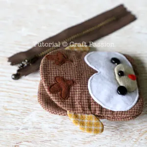 Mark the position of the muzzle, eyes, nose, and mouth on the purse. Sew around the muzzle with a slip stitch. Sew the button eyes and nose then glue the mouth.