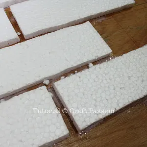 See some white spots on the brick foam? They were in fact melted spots due to the primer’s solvent, I didn’t shake it well in the first place. So, do remember to shake the primer well and get them mixed up to prevent this from happening. Luckily the brick was meant to have a damaged look, so I am safe even with the roughness that appeared on the melted spots!!! Phew!