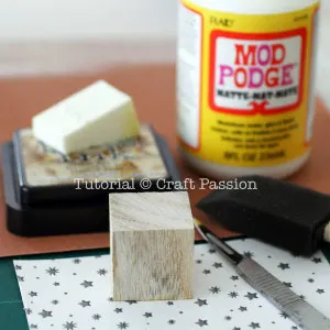 - Brush a layer of Mod Podge or craft glue onto 1 side of the cube. Cover the 4 corners and edges with glue to make sure the paper will not peel off from the edges.