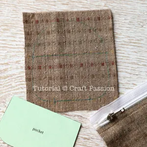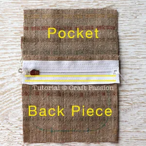 Fold the top edge of the pocket and align it on the zipper. Double top stitch with 1/4″ apart to attach the zipper on. You do not need to trace the template on the pocket piece, I did it to show you that it is the back pocket.