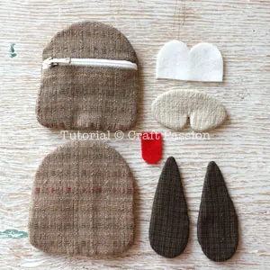 - Sew key pouch front, ears, and muzzle pieces: