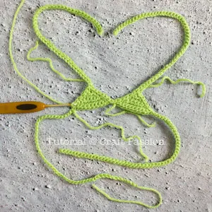 This is how the bikini should like after completed Triangle 1 and Triangle 2. I didn't hide the yarn ends in the picture (as instructed in the pattern) just to show you where the crochet begins and ends.
