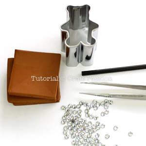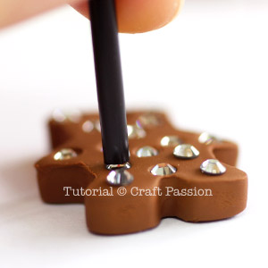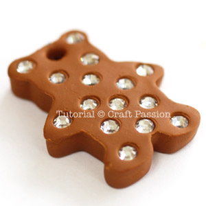 make rhinestone polymer clay craftPosition the rhinestones on the bear with tweezers. I used 15 rhinestones, you can decide how many to use depending on your bear size and rhinestone size.