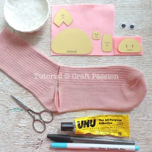 All you need for this sock pig toy is one ladies sock (yes, you only need one sock! A stray sock in pink will be great), some pink felt and stuffing materials, and glue. To see exactly what you need, scroll down to the free pig sewing pattern section below.