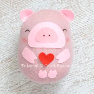Download the printable pig template, cut, and trace the pattern out on your felt for a more accurate design outline. To stick them to your sock pig, you can either glue or hand sew them on. Note that sewing on the felt pieces often lasts longer than using glue.