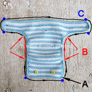 Round 1: ch, sc in next 12 sts (until you reach the red zone, point B). sc2 together in the next 30 sts (until you reach the end of the red zone). sc in next 17 sts (until you reach the bottom-right corner "blue dot" of the tab). 3sc in the corner st. sc in next st, 2sc in next hdc st, sc in next 2 sts (until you reach the top-right corner "blue dot" of the tab). 3sc in the corner st. sc in next 58 sts (until you reach the top-left corner "blue dot" of the tab). 3sc in the corner st. sc in next 2 sts, 2sc in next ch space, sc in next st (until you reach the bottom-left corner "blue dot" of the tab). 3sc in the corner st. sc in next 17 sts (until you reach the red zone on the left-hand side). sc2 together in the next 30 sts (until you reach the end of the red zone). sc in next 11 sts (until you reach the bottom-left corner "blue dot" of the diaper pants). 3sc in the corner st. sc in next 24 sts (until you reach the bottom-right corner of the diaper pants). 2 sc in the first st of the round. slst to the top loops of the first sc of the round.