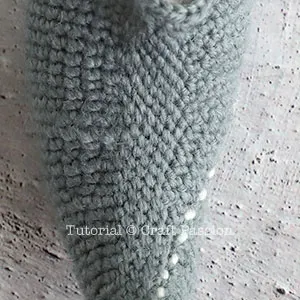 Row 8: ch, sc2tog, sc in next 14 sts, ch 2, skip 2 sts, sc in next 14 sts, sc2tog, turn. {32} [a hole for the elephant tail is made on this row]