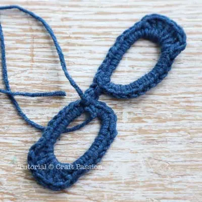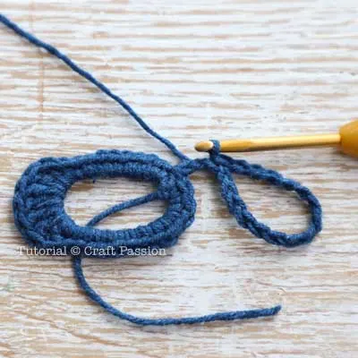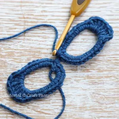 - Continue to crochet the right rim by making 18 ch stitches, then slip stitch to the 3rd ch stitch from the right ring and a bridge of 2 sts in between.