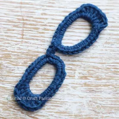 - To complete the crochet eyeglasses appliqué, make 2 sc stitches to the bridge, then slip stitch to the 1st single crochet stitch of the left rim.
