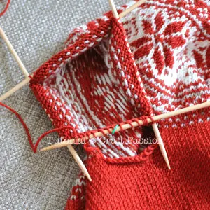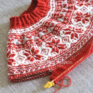 The yarns used for this Fair Isle knit sweater pattern are Superwash Merino Yarn with 100% Superwash Merino Wool. We chose this yarn because it is soft, luxurious, warm, and most importantly, it is a washing-machine-safe yarn. The total yardage needed for this knit sweater pattern is five balls, with three balls being the main color (Red / Dark Grey) and one ball of each on the secondary colors (White and Light Gray). There will be some leftover yarns after completing this fair isle sweater, you can use them to knit the beanie hat and leg warmers.
