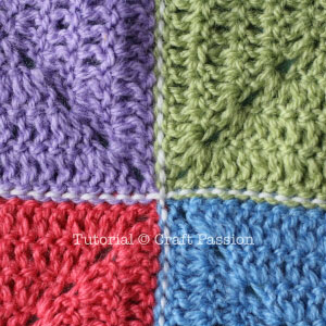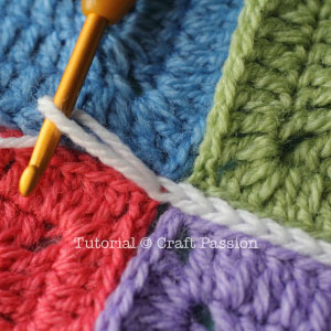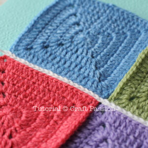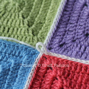 I used 4 squares in different colors and white yarn to join so that you can see the stitches clearly.